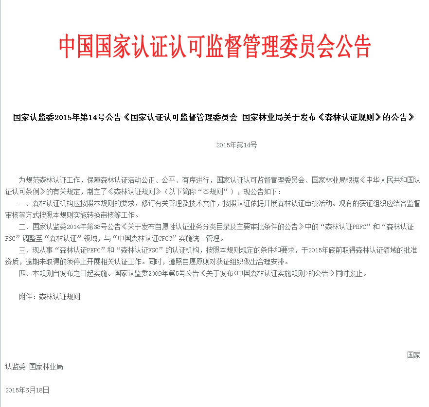 国家认监委2015年第14号公告《国家认证认可监督管理委员会 国家林业局关于发布《森林认证规则》的公告》